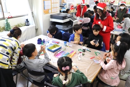午前の部・午後の部とも先生方もサンタに仮装し盛り上がりました!今回はビンゴ大会の目王は、お菓子のつかみ取り、意外に子供達がたくさんのお菓子をゲットしたのでびっくりしました。ポイント交換も今回は大奮発日頃宿題を皆さん頑張ってるのでご褒美です。次回までにたくさんポイントをまた貯めましょう。(子供達のミニライト作品も点灯して楽しんでくださいね!)