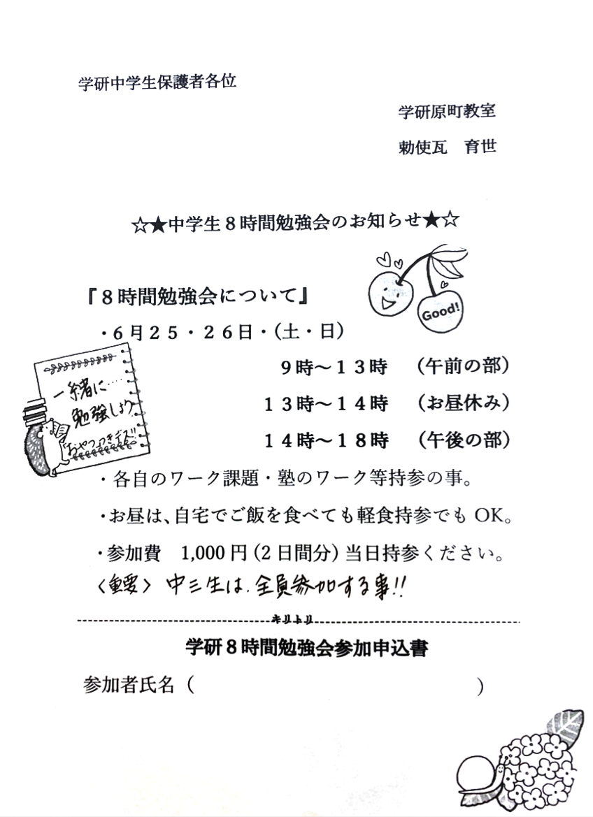 - 定期テスト対策として、8時間勉強会を実施いたします。皆さん参加してください。