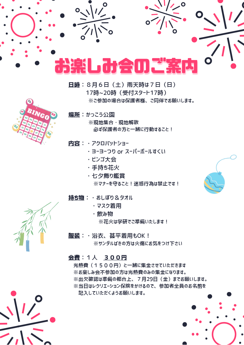 光熱費(1,500円)とお楽しみ会参加費(300円)を集金袋にて集金させていただきます。(光熱費については1家庭につき1,500円とさせていただきます。)