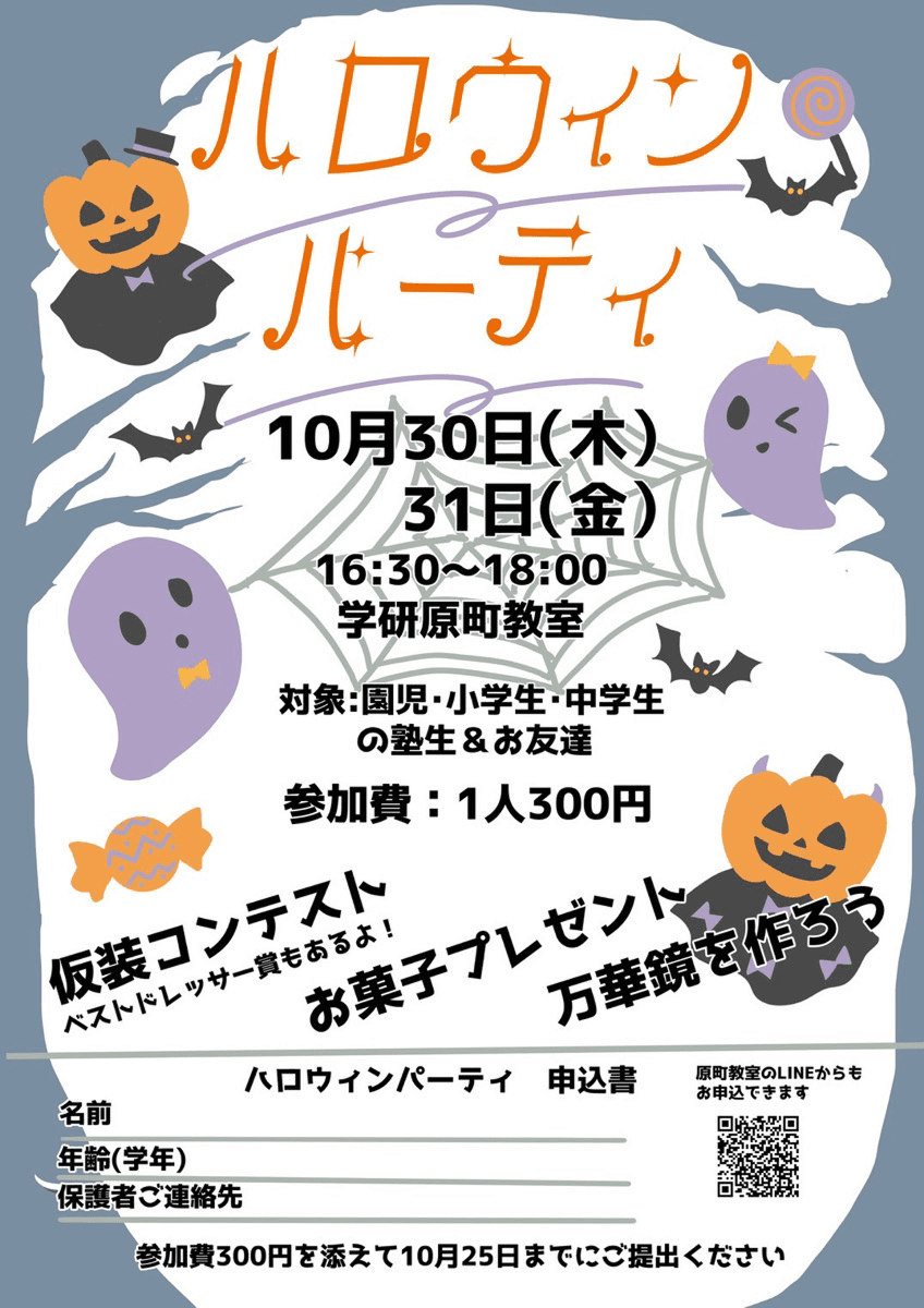 今年も『ハロウィン祭り』を教室時間でいたします。みなさんも仮装してぜひご参加ください!
