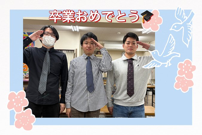 同じ方向を目指し一緒に仕事ができたことは、私にも子供達にとっても大きな力となり成果を上げることができたと思います。たいき先生は就職で東京へ、いわい先生は教員に、こうせい先生は大学院進学とそれぞれの道へ進まれます。